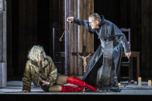 Durchweg rührend allerdings: Der Kleine will „seinen“ Helden gewinnen sehen, versucht, ihm die richtigen Antworten aus seinem Buch zu zeigen, ihn von den Blumenmädchen wegzureißen – doch zunehmend verselbstständigt sich das Geschehen; Gurnemanz und später auch Kundry steuern das Geschehen mit. Geduld, mein Junge, macht Gurnemanz dem Jungen klar, dein Held muss aus sich heraus zum Helden werden. Das alles spielt Kinderstatist Leander Wilde als träumender Erzähler der Parsifal-Geschichte – über vier Stunden lang fast durchgehend auf der Bühne – mit einem ganz natürlichem Detailreichtum und nicht einem einzigen Moment der Unsicherheit, was ihn völlig verdient bei den Vorhängen ganz zuletzt gemeinsam mit dem gesungenen Parsifal erscheinen lässt. Tenor Eric Cutler als ebendieser wirkt als Teil einer Besetzung, die insgesamt auf klassisch-durchschlagende „Heldenstimmen“ verzichtet, leiht der Rolle ein jugendliches, lyrisches Stimmfundament und hinreichend kraftvolle Höhen bei Bedarf. Das passt zum „reinen Toren“, der nicht als Held beginnt. Einzig das deutsche ‚ch‘ macht in der Aussprache leider Schwierigkeiten und wird regelmäßig zum ‚sch‘. Georg Zeppenfeld als Gurnemanz besticht mit erstklassiger Diktion, ordentlich eingeflochtener Spannung in seinen vielen Dialogmomenten. Einmal mehr ist hier zu bewundern, wie unglaublich gleichmäßig und fluide diese Bassstimme in allen Registern, auch in den Spitzentönen, klingt. Michèle Losier singt ihre erste Kundry mit schlankem Mezzo, einem wirkungsvollen bis hin zu loderndem Crescendo auf diesem legendären „Und – lachte!“, doch wünscht man sich manchmal mehr von einem gewissen Etwas, sei es Glanz oder Schwärze, in der Stimme. Darstellerisch skizziert sie gekonnt eine Frau eingeklemmt im Kampf, voller Selbstverachtung, doch nicht ohne ihre Würde. Scott Hendricks steuert einen passenden Klang für den Bösewicht Klingsor bei, besticht mit versierter Phrasierung. „Furchtbare Not […] so lacht nun der Teufel mein“ kommt sogar mit Gravitas und großem emotionalem Ernst. Oleksandr Pushniak bleibt klangschön, könnte sich des Öfteren mehr trauen, in unterschiedliche Richtungen auszubrechen in den Monologen des Amfortas. Albert Dohmen als Titurel punktet mit einer geschickten stimmlichen Wandlung: absichtlich ältlicher Klang in seinen ersten Sätzen und erfrischte, volle Töne nach der Gralsenthüllung