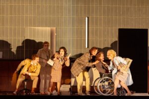 Der alte kinderlose Buoso Donati ist endlich gestorben und hinterlässt sein nicht unerhebliches Vermögen einem Kloster. Die Verwandtschaft, alle in Buosos Haus versammelt, ist empört. Die panische Suche nach dem Dokument – hinterher ist der ganze Boden von Papieren bedeckt – bestätigt den Verdacht. Der junge Rinuccio (Khanyiso Gwexane) hat die Idee, den pfiffigen Gianni Schicchi, Vater seiner Angebeteten Lauretta (Heejin Kim), um Rat zu fragen. Gherardo (Sergio Augusto) und Nella (Yeeun Yeo) schicken ihren Sohn Gherardino (Ben Jamal Akki), Gianni Schicchi zu holen, während Zita (Almuth Herbst), Buosos Cousine und seine nächste Verwandte und Simone (Yeven Rakhmanin) sich mit Marco (Simon Stricker) und seiner Frau La Ciesca (Anke Sieloff) drüber ereifern, wie sich die Mönche an Bousos Vermögen mästen werden. Gianni Schicci erscheint – großer Auftritt des Heldenbaritons Benedict Nelson im Proletenaufzug, Jogginganzug in Blau und Orange und Turnschuhen, der im krassen Gegensatz zu den spießigen Tailleurs und Anzügen der feinen Verwandtschaft steht. Die zeitlosen Kostüme schuf Carola Volles. Blitzschnell erfasst er die Situation: noch weiß niemand vom Buosos Tod, aber das Testament zu Gunsten des Klosters wurde notariell abgefasst und aufgefunden. Keine Chance, teilt er nach kurzer Überlegung mit. Auf die Frage, ob man mit der Hochzeit Rinuccios mit seiner Tochter Lauretta einverstanden sei, das krasse Nein der gehobenen Schicht gegenüber dem Proleten. Schicchi will schon wieder gehen, da bittet ihn seine Tochter mit einer der anrührendsten Arien der Opernliteratur: „Oh mio babbino caro“, doch noch einmal nachzudenken und sich für sie und Rinuccio einzusetzen. Schicci willigt seiner Tochter wegen ein. Es sei zwar strafbar, und wer erwischt würde, dem würde die Hand abgeschlagen, aber er werde es versuchen. Man müsse dem Notar ein neues Testament diktieren, das das vorliegende aufhöbe. Der Besuch des Arztes Maestro Spinelloco (Maksim Andreenkov) stellt Schicchi auf die erste Probe: mit zittriger Greisenstimme verkündet er, es gehe ihm bereits besser, die Medizin habe geholfen, der Dottore möge später wiederkommen. Der merkt nichts und verzieht sich. Man könne das Risiko wagen, er werde dem Notar ein neues Testament diktieren. Die Verteilung des Besitzes ist unstrittig, bis auf das Familienwohnhaus in Florenz. Da versucht jede Partei, Schicchi zu bestechen, dass dieses ihr zufällt. Als der Notar (Piotr Prochera) mit zwei Zeugen, die umständlich einen giftgrün blinkenden Apple 2e Steinzeitcomputer aufbauen, erscheint, diktiert Schicchi mit tief ins Gesicht gezogener Schlafmütze und Greisenstimme das Testament. Jeder bekommt etwas, aber das Haus in Florenz und die Mühle vermacht er kurzerhand sich selbst: Gianni Schicchi. Dann schmeißt er die ganze Bagage aus seinem Haus.