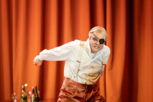 Im zweiten Akt passiert musikalisch erst einmal nichts. Eine elegante junge Frau, Wotans Gattin Fricka, sitzt, mit einem weißen Negligée bekleidet, in einem bürgerlichen Wohnzimmer, das an den „Red Room“ aus David Lynchs Twin Peaks erinnert, blickt auf ein Röhrchen, anscheinend einen negativen Schwangerschaftstest, und bekommt einen Tobsuchtsanfall. Aus einem seitlichen Schrank zieht sie ein Ultraschallgerät und fährt sich mit dem Schallkopf über den Unterleib – keine Schwangerschaft erkennbar. Ihr Mann Wotan, unschwer erkennbar an der orangefarbenen Uniform mit Breeches und Reitstiefeln und der schwarzen Augenklappe, unterhält sich lebhaft mit einer attraktiven Blondine, offensichtlich seiner Lieblingstochter Brünnhilde. Auffallend ist, dass die Kostümbildnerin Mona Ulrich für die Kostüme der Götter und Walküren glänzende Seidenstoffe verwendet. Die Stimmung vereist, als Fricka den Raum betritt und Wotan die bekannte Szene macht, ein gelungener Moment der Inszenierung mit hervorragenden Sänger-Darstellern und einem dienend behandelten Orchester. Wotan gibt klein bei, und Fricka rauscht hinaus. Die Fortsetzung des Dialogs mit Brünnhilde ist noch intensiver: wie hier der frustrierte Herrscher seiner emotionalen Tochter erklärt, dass er an Verträge gebunden ist und – leider – seinen einzigen Sohn der Konvention opfern muss, geht unter die Haut. Brünnhilde, gehorsame Tochter, verspricht, wider bessere Einsicht, Gehorsam, und Wotan bleibt als gebrochener Mann zurück. Der Szenenwechsel im Bühnenbild von Pia Dederichs und Lena Schmidt ist dank Vorhang schnell möglich, die Szene setzt sich unmittelbar fort.