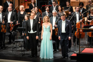 Dass es generell nicht optimal ist, wenn die Solisten an der Rampe, dem Dirigenten mit dem Rücken zugewandt Position nehmen, weil in dieser Konstellation kaum Blickkontakt möglich ist, hat mich Riccardo Muti gelehrt, der einzige mir bekannte Dirigent, der grundsätzlich Sänger vor sich platziert, so dass er ihnen in die Augen schauen kann. Zugegebenermaßen ist eine solche Aufstellung bei einer Dramaturgie mit Kleiderwechseln, wie an diesem Nachmittag in Berlin zu erleben (die Sopranistin trägt bei jedem Stück eine andere Farbe) schwer einzurichten. Aber dass Thielemann auch nicht ganz glücklich ist, wenn er die Sänger allenfalls mit einem seitlichen Blick über die Schulter ins Visier nehmen kann, ist nicht zu übersehen: Zwei Mal – in dem Lied „Liebe, du Himmel auf Erden“ und dem anschließenden Duett „Niemand liebt dich so wie ich“ – wenn es besonders leise, innig und intim wird, bewegt er sich vom Podium herunter, um ganz dicht vor seine Sänger zu treten, sich mit ihnen auf einer Welle in die tiefsten Gefilde dieser Musik zu begeben. Wo derart sublim musiziert wird, stellt sich eine Ahnung ein, wie ein Interpret, der sich auf Operette versteht, wohl Wagner und Beethoven dirigiert.